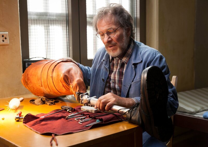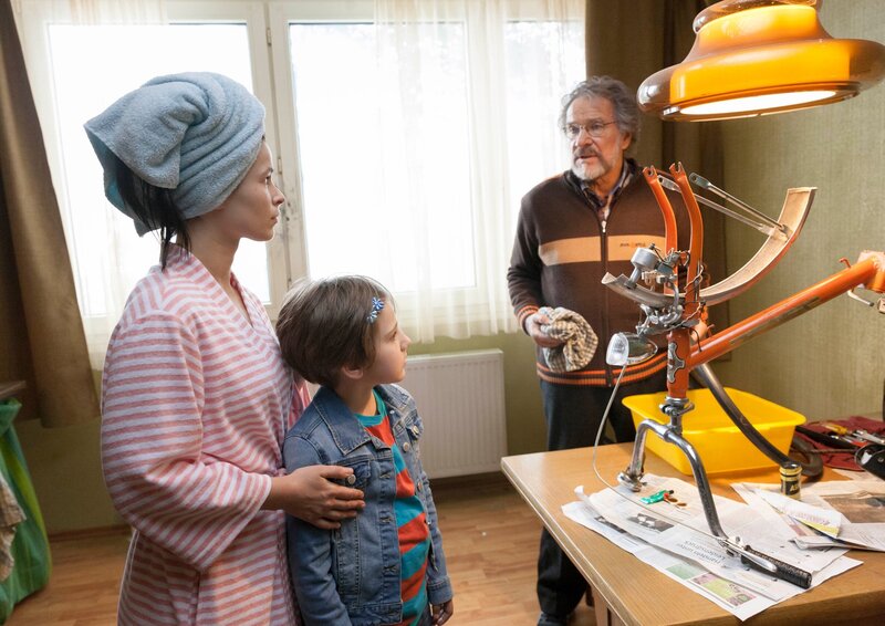 Joseph Komalschek (Götz George) repariert das Fahrrad von Emily (Grace Serrano Zameza). Ihre Mutter Natalia (Anna Fischer) steht dem misstrauisch gegenüber.