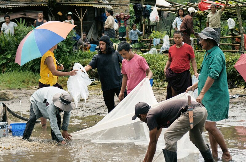 Zusammen mit Mitgliedern des Jangsa-Tierrettungsvereins rettet Sonam (3.v.l.) Fische aus einem Zuchtteich. Der Respekt und die Erhaltung des tierischen Lebens ist Teil der buddhistischen Lehre, der er folgt.Bild: © NDR/Sonam Rinzi