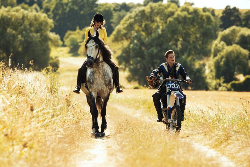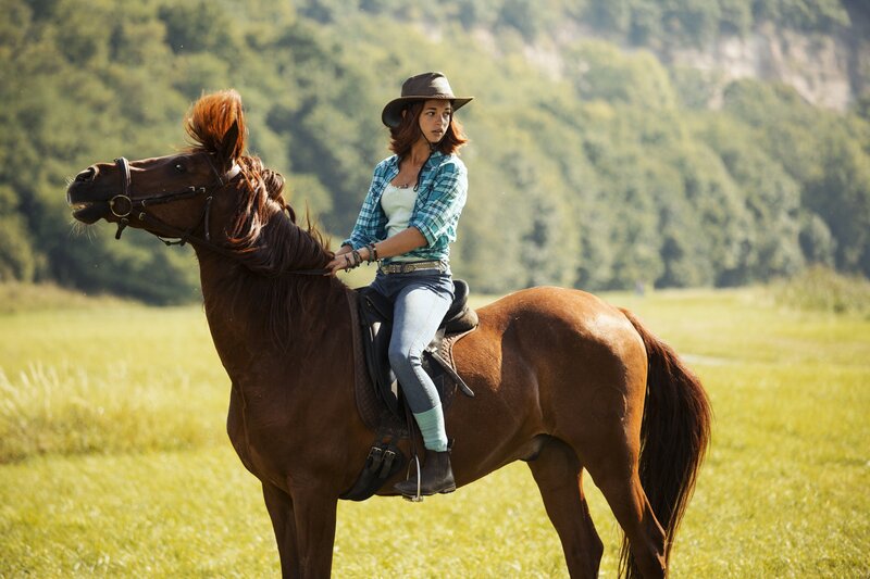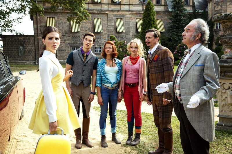 Die verwöhnte Sophia (Ruby O. Fee, l.) wird von ihren ländlichen Gastgebern, Alexander (Louis Held, 2.v.l.), Tina (Lisa-Marie Koroll, 3.v.l.), Bibi (Lina Larissa Strahl, 3.v.r.), Graf Falko (Michael Maertens, 2.v.r.) und Dagobert (Martin Seifert, r.), begrüßt.