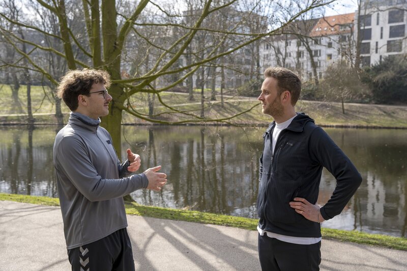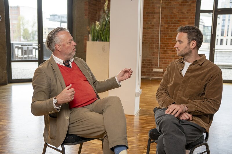 Psychologe Leon Windscheid (r.) trifft Max (l.). Dessen Erfahrungen beim Sex waren lange von dem Gefühl geprägt, Leistung erbringen zu müssen. So stark, dass er psychisch darunter litt. Zusammen gehen sie der Frage nach: Wie lösen wir uns vom Performancedruck beim Sex?