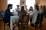 Mirko (Pasquale Aleardi, li.) ist zurück! Sein Vater Borko (Peter Prager, r.e), seine Mutter (Gundi Ellert, 3. v. re.), seine Schwester Elena (Marie Leuenberger, 2. v. re.), seine Nichte Nele (Aleen Jana Kötter), sein Bruder Goran (René Geisler) und dessen Freundin Manu (Henrike Hahn, 3. v. re.) sind gespannt, was ihn nach Hause führt.