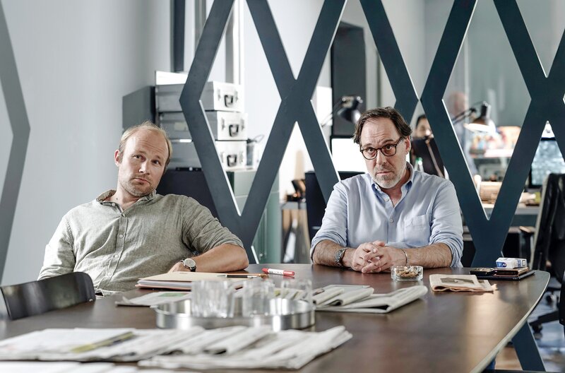 Chefredakteur Meixner (Thomas Loibl, re.) und sein Mitarbeiter Gert (Christoph Pütthoff, li.) setzen Jungjournalistin Aga auf einen Vermisstenfall in der hessischen Provinz an.Bild: © Tatiana Vdovenko/ZDF