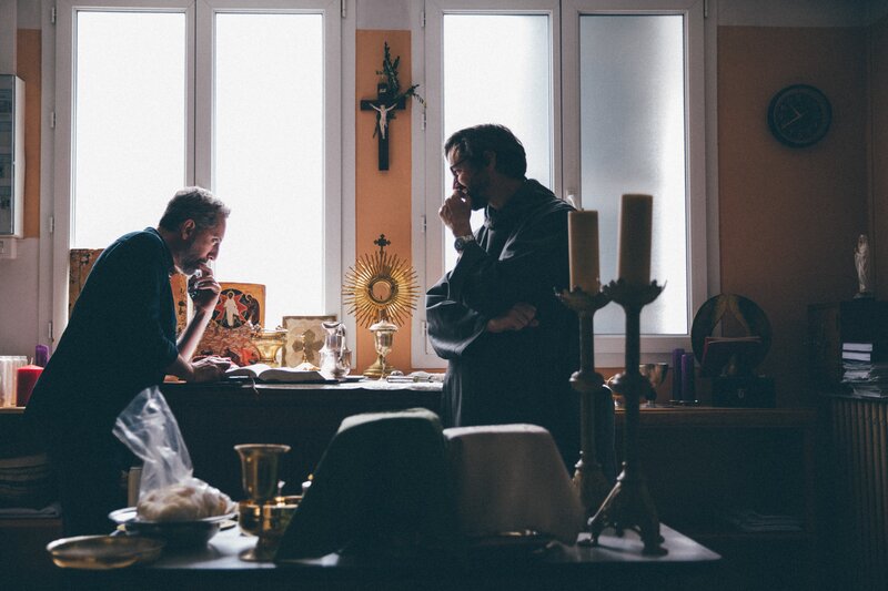 Pater Barthélémy (Nicolas Port, rechts) ist bereit, Gad (Gad Elmaleh) zu taufen.Bild: © ZDF und BR, Studiocanal, Laura Gilli
