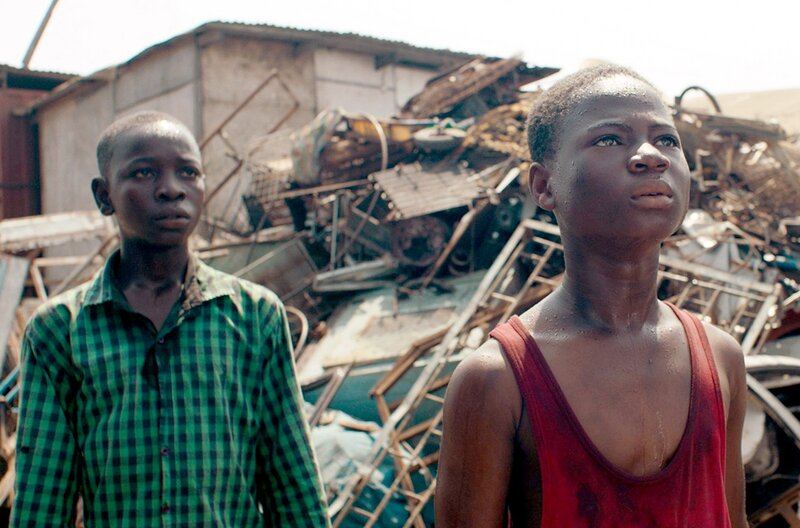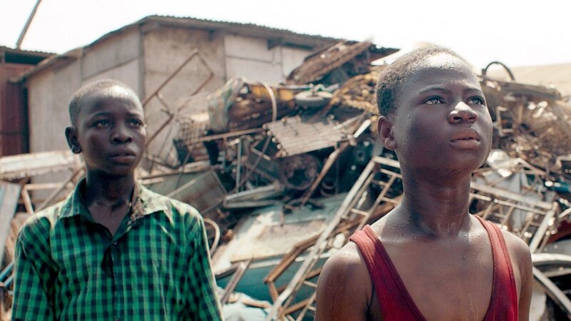 Kojo (Emmanuel Affedzi, re.) hat auf der Schrotthalde gearbeitet, statt zur Schule zu gehen, und wurde daraufhin von seinem Bruder Kofi (Jamal Baba, li.) zum Vater gebracht.Bild: © SWR / Chromosom Film