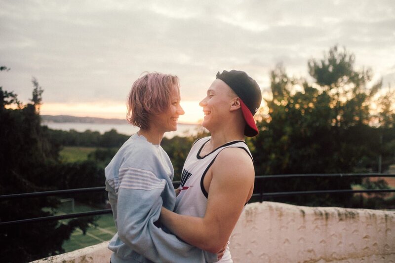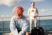 Innehalten am Hafen von Ibiza. Toni (Lana Cooper) und Bruno (Julius Nitschkoff ).Bild: © BR, ifs internationale filmschule köln, Film- und Medienstiftung Nordrhein-Westfalen, Katharina Kolleczek & Lea Neu Kalekone Film GbR / BR/Film- und Medienstiftung Nordrhein-Westfalen/Katharina Kolleczek & Lea Neu Kalekone Film GbR/ifs …