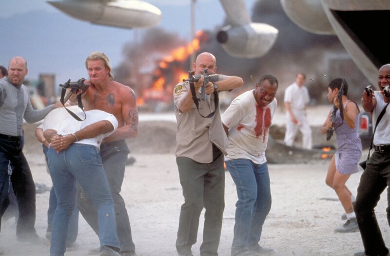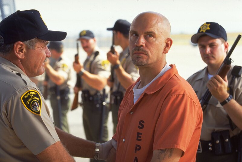 Eines Tages soll eine Gruppe Schwerverbrecher mit einem Flugzeug in ein neues Hochsicherheitsgefängnis verlegt werden, darunter auch der hemmungslose Killer Cyrus "The Virus'" Grissom (John Malkovich, M.). Doch dem Sadisten gelingt es, die Con Air in seine Gewalt zu bringen ...Bild: © TVP
