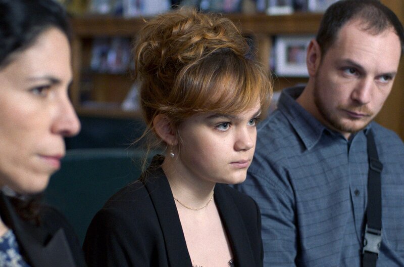Begleitet von der Kinderanwältin (Yasmina Maïza, li.) und ihrem Erzieher Jayden (Alexis Manenti, re.) beharrt Dalva (Zelda Samson, Mi.) vor dem Richter auf der Unschuld ihres Vaters.Bild: © Caroline Guimbal/Helicotronc/Tripode Productions/RET