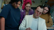 Ricky (Safinaz Sattar, l.), Victoria (Sonja Weißer, 2.v.l.) und Malou (Zoe Stein, r.) und ihr Sozialbetreuer Ballack (Jan Bülow, 2.v.r.) hecken einen Plan aus.Bild: © ZDF und Edgar Fischnaller, Jonas Kolahdoozan