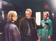 Medizinstudentin Karin Schmidt (Floriane Daniel) untersucht in der Pathologie ihren toten Freier Helmut Braun. Ihr Professor (Karl Markovics, Mi.) und sein Assistent Peter (Wilfried Hochholdinger) beobachten sie.Bild: © RTLplus / Frank Hempel