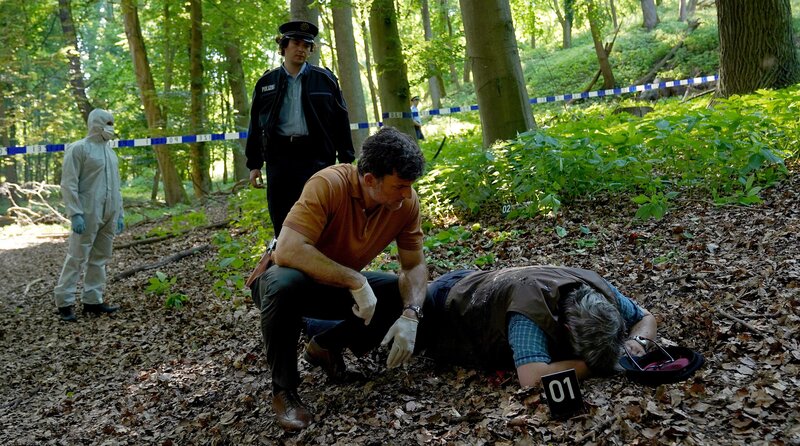 Kommissar Ritter (Torben Liebrecht, Mitte) am Tatort: Arko Haumann (Walter Plathe, re.) wurde mit 12 Messerstichen ermordet!Bild: © ARD Degeto Film/MadeFor Film GmbH/Hans-Joachim Pfeiffer