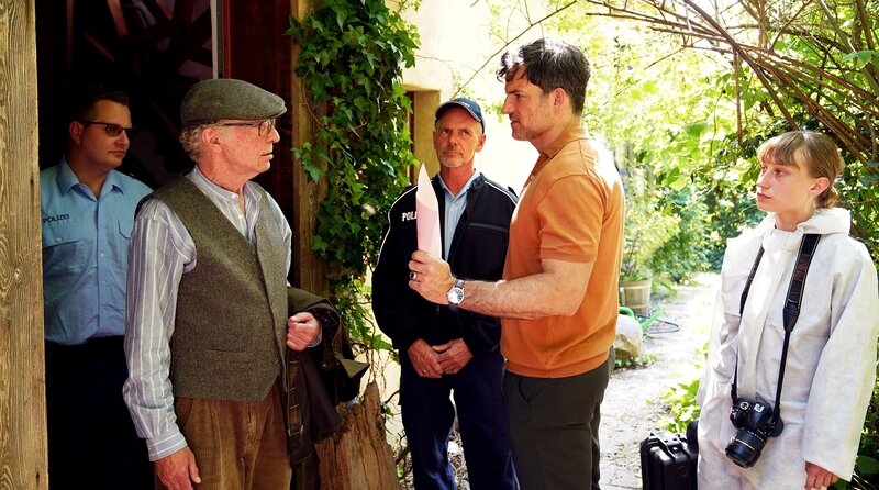 Kommissar Ritter (Torben Liebrecht, e. v. re.) verhaftet den Hobbyschatzsucher Paul (Elmar Gutmann, 2. v. li.).Bild: © ARD Degeto Film/ARD Degeto Film/MadeFor Film GmbH/Hans-Joachim Pfeiffer