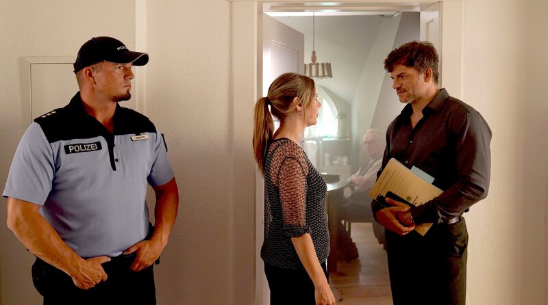 Kommissar Ritter (Torben Liebrecht, re.) will mit Kims (Felicitas Woll, Mitte) Hilfe den rätselhaften Fall aufklären.Bild: © ARD Degeto Film/ARD Degeto Film/MadeFor Film GmbH/Hans-Joachim Pfeiffer