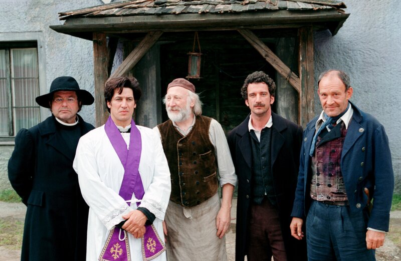 Erwin Steinhauer (Nöstler), Tobias Moretti (Joseph Mohr), Karl Merkatz (Angerer-Wirt), Heio von Stetten (Franz Gruber), Michael Mendl (Hans Schlagerer).Bild: © ORF