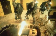 Leeloo (Milla Jovovich, l.), Cornelius (Ian Holm, r.) und Korben (Bruce Willis, M.) sind entschlossen, die vier rettenden Steine in ihren Besitz zu bringen. Sie nehmen den Kampf gegen das Böse auf ...