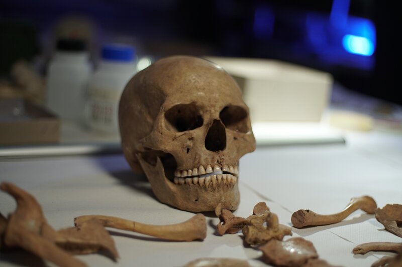 Der Schädel der Schamanin von Bad Dürrenberg zeigt eine auffällige Besonderheit: Die oberen Schneidezähne waren künstlich abgeschrägt. Gehörte das Feilen der Zähne zu einem schmerzhaften Initiationsritus?Bild: © ZDF/Tom Nicklaus