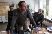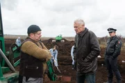 Die Ausgrabungen am Fundort haben begonnen. Kommissar Keller (Robert Atzorn, 2.v.r.) befragt Paul (Matthias Buss) wegen des Schädels. Warum wollte Paul den Fund zunächst vertuschen?Bild: © Marion von der Mehden / ZDF