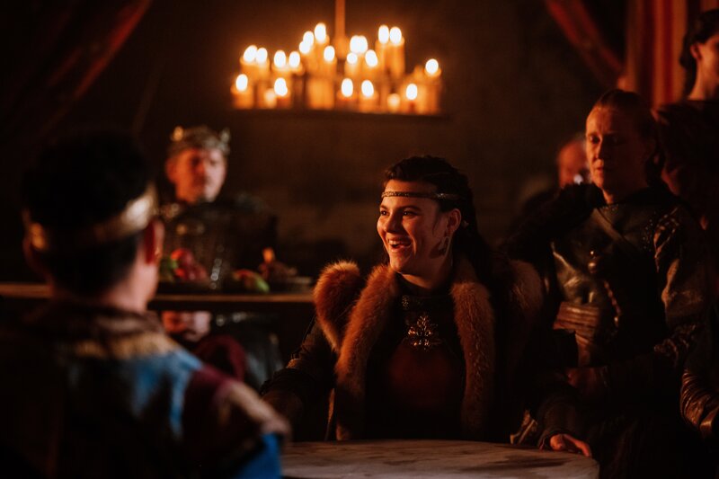 Prinzessin Griseldis (Alina Hidic, M.) hat zur Brautwerbeschau eingeladen. Sie will mit drei Prüfungen heraus-finden, welcher der adeligen Kandidaten am besten zu ihrer eher etwas rauen Art passt.