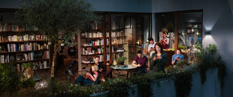 Gemeinsamer Abend: Rocco (Wotan Wilke Möhring, 3. v. li.) und seine Frau Eva (Jessica Schwarz, 2. v. li.) haben ihre Freund*innen Leo (Elyas M’Barek, 3. v. re.), Pepe (Florian David Fitz, hinten re.), Carlotta (Karoline Herfurth, Mitte), Simon (Frederick Lau, li.) und Bianca (Jella Haase, vorne re.) eingeladen.Bild: © ARD Degeto/Constantin Film Verleih GmbH/Lucia Faraig