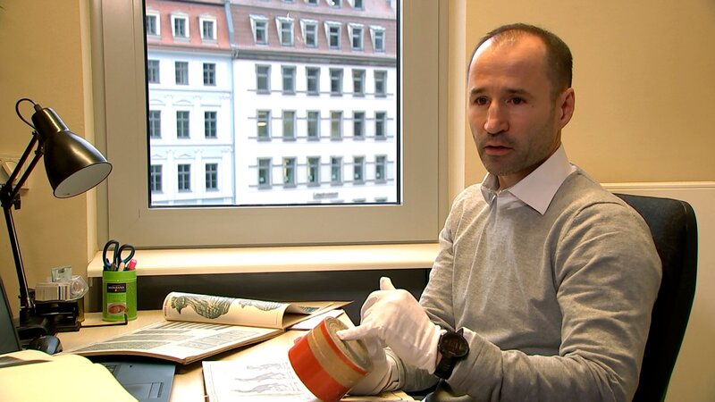 Ivo Schaffer sammelt seit Jahren alles, was an die große Schokoladenvergangenheit Dresdens erinnert. Hier hält er eine Kakaodose von der Firma Jordan und Timaeus in Händen, die über 150 Jahre alt ist.Bild: © MDR / MDR/HA Kommunikation
