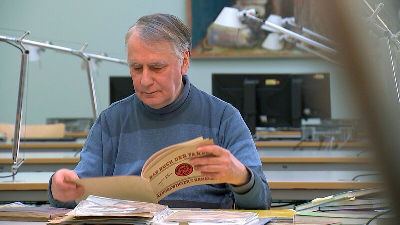 Uwe Hessel erforscht seit Jahren ehrenamtlich die Schokoladengeschichte Dresdens. Wie hier im Stadtarchiv Dresden sichtet er alte Firmenunterlagen, Anzeigenblätter und Handelsregister.Bild: © MDR / MDR/HA Kommunikation