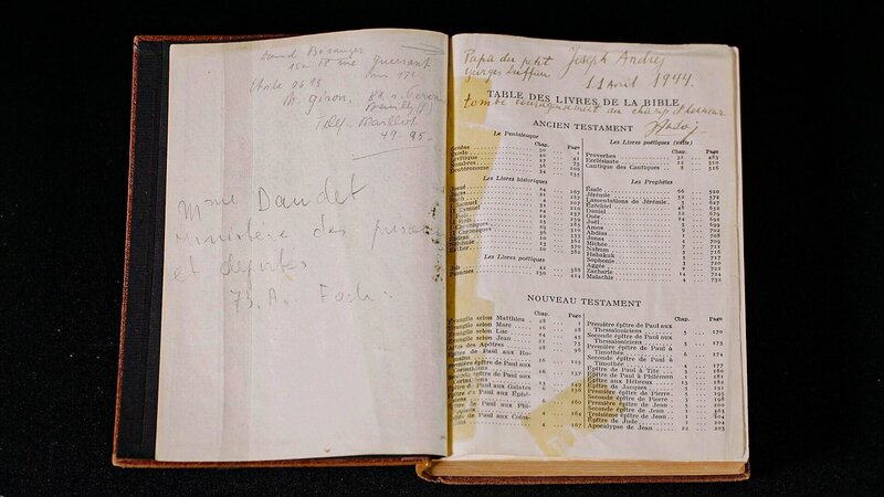 In der Bibel des Abbé Franz Stock hinterließ Joseph Epstein seine letzten Worte zum Gedenken an seinen Sohn Georges Duffau-Epstein.Bild: © ORF/Kinescope Film