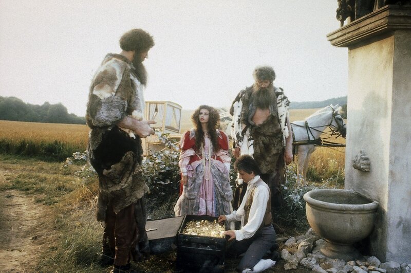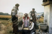Prinzessin, tapferes Schneiderlein und Riesen am Brunnen. (Amanda Sandrelli, Miroslav Noga, Chris Greener, Alexander Sizonenko).Bild: © Omnia-Film