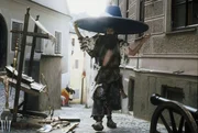 Ankunft der Riesen und Arconia. Über die Riesen wurde soviel erzählt, dass die für sie genähten Kleider und Hüte überdimensional sind. (Chris Greener).Bild: © Omnia-Film