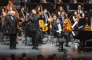 Das West-Eastern Divan Orchestra unter der Leitung von Daniel Barenboim (vorne li.) und Starpianist Lang Lang (vorne Mi.) spielen Musik von Maurice Ravel und Manuel de Falla.Bild: © Marco Borelli