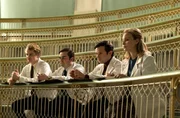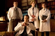 Prof. Dr. Kohlfeld (Fritz Karl, vorne) arbeitet mit den Männern Rupert von Aigner (Thimo Meitner, re.), Gold (Justus Czaja, 2. v. re.) und Martinek (Damian Thüne, li.) zusammen.