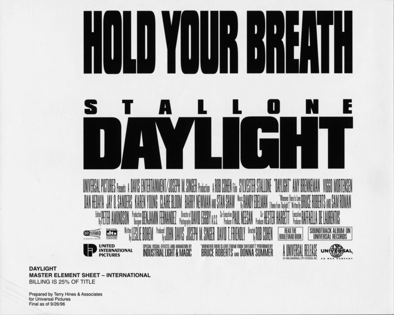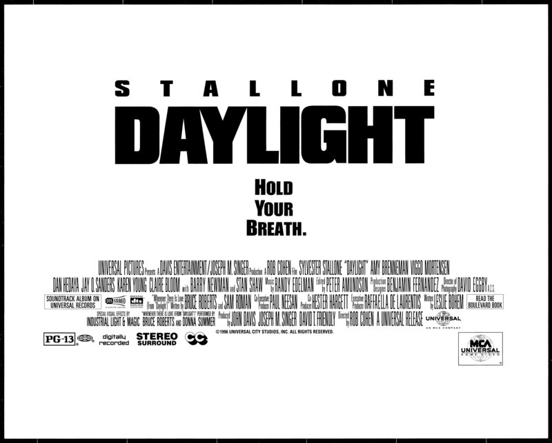 Regisseur Rob Cohen ("The Fast And The Furious", xXx - Triple X", "Die Mumie - Das Grabmal des Drachenkaisers") inszenierte mit "Daylight" einen erstklassigen Katastrophen-Thriller, der die Zuschauer von der ersten Minute an mit Action und dramatischen Szenen in Atem hält. Für die aufwändigen Dreharbeiten wurde der New Yorker Holland-Tunnel in den italienischen Cincecitta-Studios in Rom nachgebaut. Viggo Mortensen, der den Survival-Experten Roy spielt, stand 1994 während der Dreharbeiten zu "Daylight" noch am Anfang seiner Karriere. 2001 erlangte er mit der Rolle des Aragorn in Peter Jacksons "Herr der Ringe"-Verfilmung Weltruhm. In einer kleinen Rolle als jugendlicher Strafgefangener Vincent ist Sylvester Stallones Sohn Sage zu sehen. Der heute 28-Jährige stand bereits in "Rocky V" gemeinsam mit seinem berühmten Vater vor der Kamera. "Sylvester Stallone liefert inmitten des pausenlosen Effekte-Feuerwerks eine energiegeladene Vorstellung als klassischer "Retter in letzter Not" ab. Die grandiosen Stunts, die geradlinige Survival-Story und die furios geschnittenen Bilder machen diesen Film zu einem atemberaubenden Abenteuer." (Quelle: mediabiz.de)