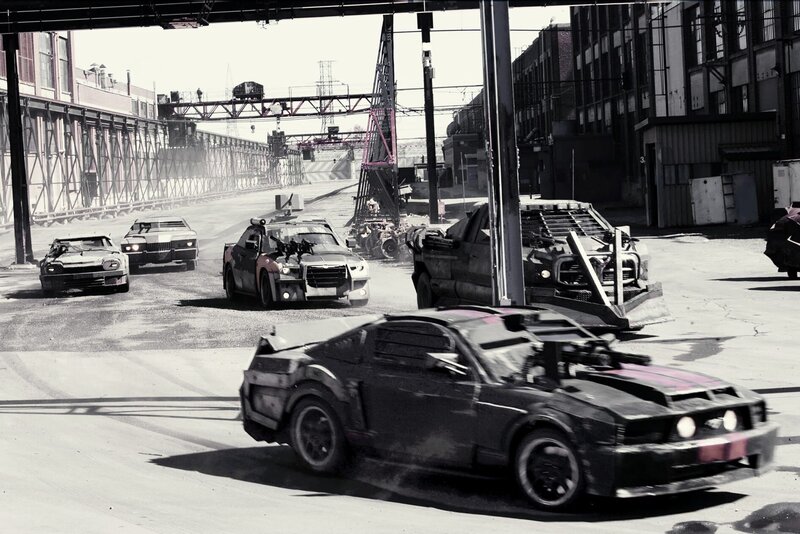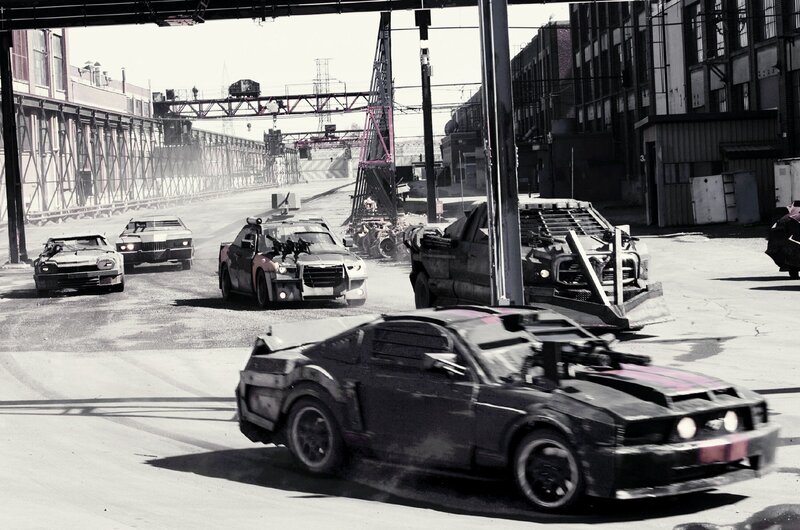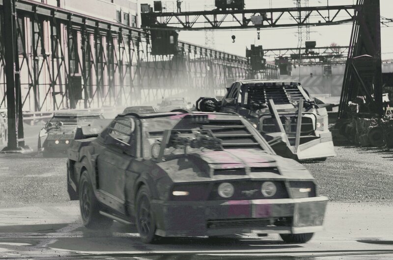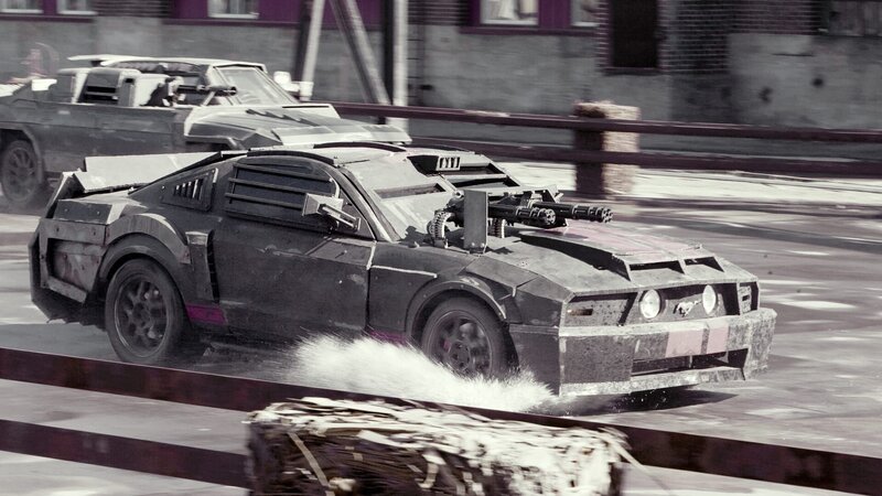 Machine Gun Joes Dodge und Frankensteins Mustang flankieren das "Schlachtschiff", welches die Direktorin mit allen möglichen Waffen hat ausstatten lassen hat. Wer ist stärker?