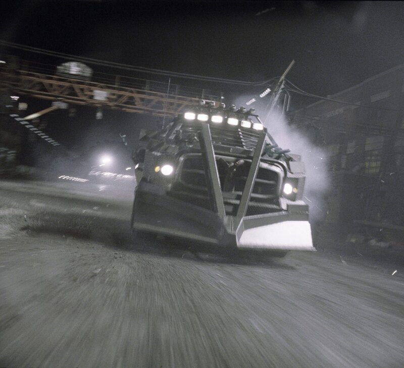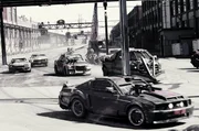 Machine Gun Joes Dodge und Frankensteins Mustang flankieren das "Schlachtschiff", welches die Direktorin mit allen möglichen Waffen hat ausstatten lassen hat. Wer ist stärker?; Machine Gun Joes Dodge und Frankensteins Mustang flankieren das "Schlachtschiff", welches die Direktorin mit allen möglichen Waffen hat ausstatten lassen hat. Wer ist stärker?