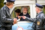 Jetzt wird es brenzlig: Wilhelm Schürmann (Jürgen Prochnow) und Felix (Marinus Hohmann, hinten.) werden von den Beamten Gruber (Arnd Schimkatt, li.) und Niedermeier (Wowo Habdank, re.) kontrolliert.Bild: © ARD Degeto/Martin Rottenkolber