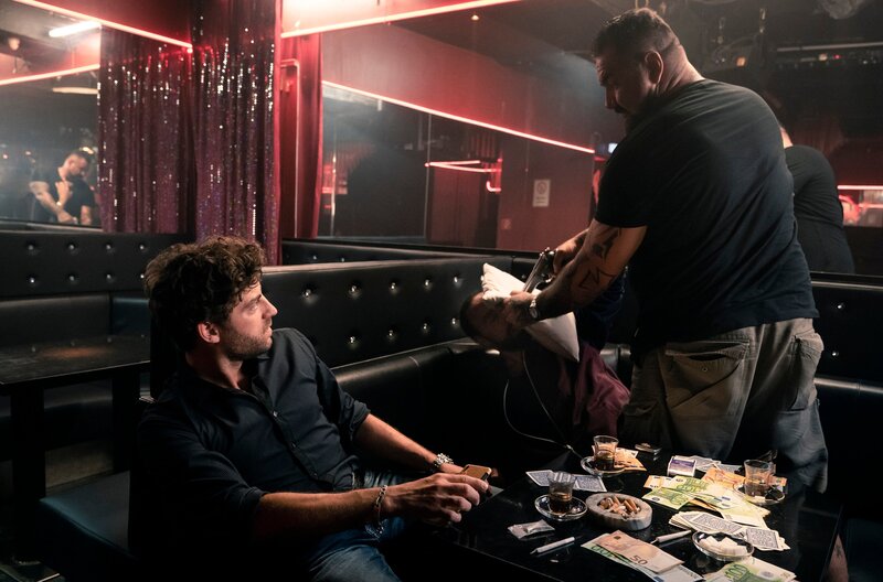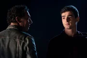 Gangsterboss Ahmed Sayed (Timur Isik, hinten) will den Zeugen Miki (Aaron Hilmer) töten.Bild: © ARD Degeto/Stephan Rabold / ARD Degeto/Programmplanung und P