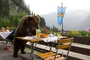 Nachdem sich die Gäste in wilder Panik ins Haus geflüchtet haben, labt sich Bär Bruno in aller Ruhe am Bier.
