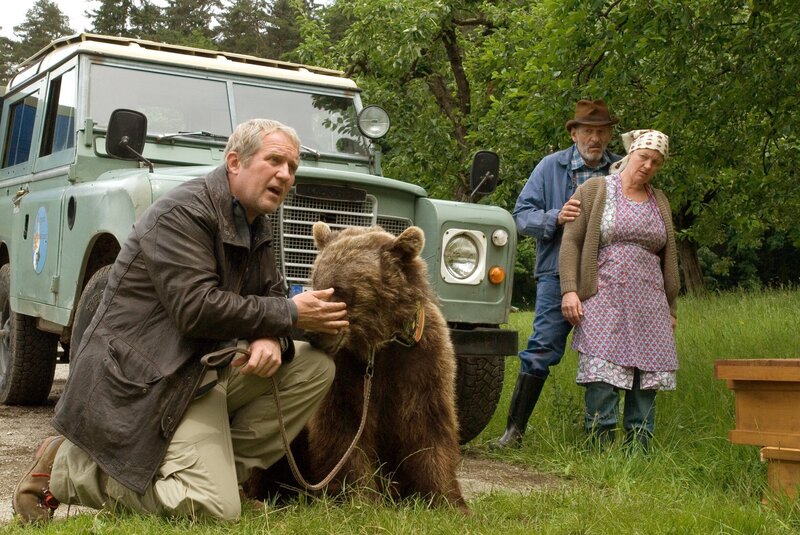 Mit einer Mischung aus Angst und Neugier beobachten der Bauer (Pepi Pittl) und seine Frau (Claudia Hafringer) den Tierparkdirektor Konrad Rettensteiner (Harald Krassnitzer, rechts), der die Bärin Cilly beruhigt.