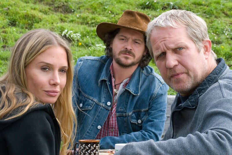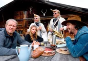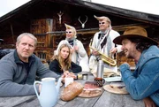 Bei einer gemeinsamen Brotzeit auf der Alm stärken sich der Tierparkdirektor Konrad Rettensteiner (Harald Krassnitzer, links), die Tierschützerin Linde Blümel (Nadeshda Brennicke) sowie der Jäger Hubert Wolfgruber (Fritz Karl, rechts), um die Suche nach Bruno anschließend fortsetzen zu können. Allein die beiden finnischen Bärenjäger (Eero Milonoff, dritter von links, Jarmo Mäkinen) wollen die Rückreise antreten, da ihre Hunde "Heimweh haben".