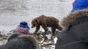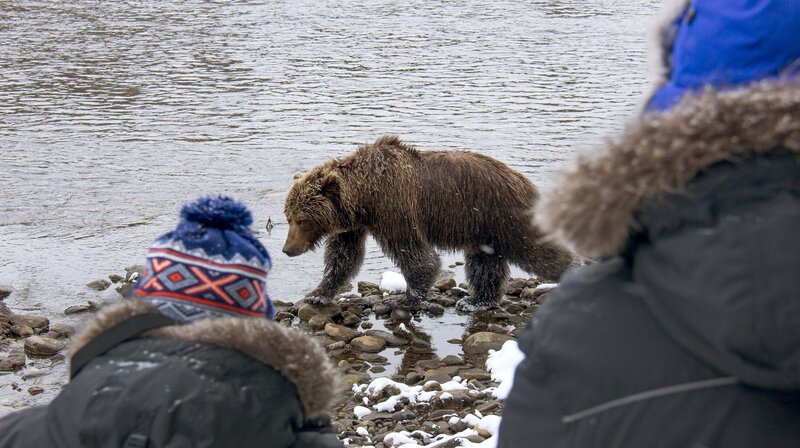 Grizzlybär mit zwei Menschen am Fishing Branch River im Yukon in Kanada.Bild: © WDR/Phil Timpany/Omnifilm Entertainment