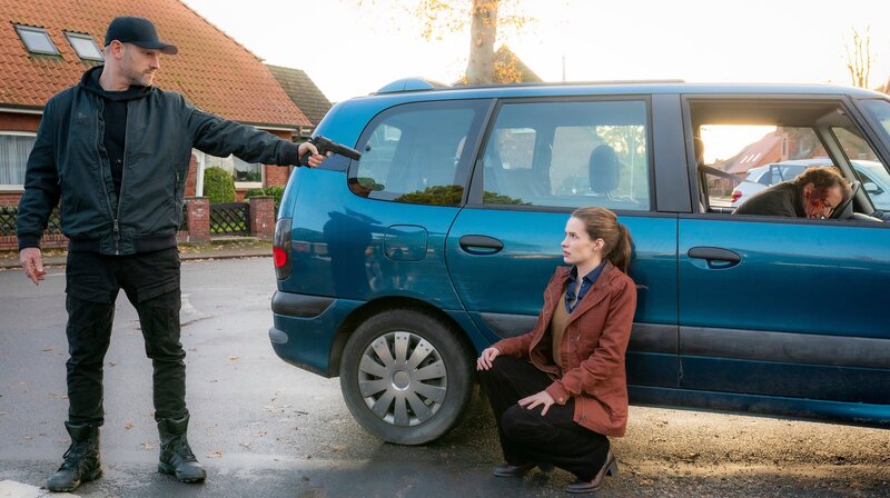 Kronzeugin Fiona (Marlene Tanczik) wird von einem Söldner (Christoph Domanski) bedroht.Bild: © ARD Degeto/Boris Laewen