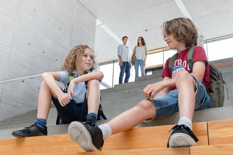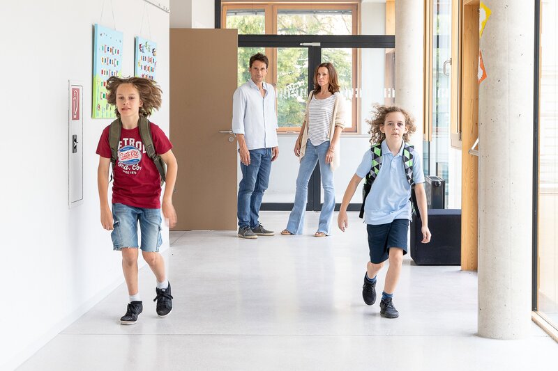 In der Schule gibt es Ärger: Marion (Doris Schretzmayer, 2. v. li.) und Clemens (Oliver Mommsen) sind beim Schuldirektor, weil es Zoff zwischen Sam (Nikolai Horwath, li.) und Benny (Felix Staudigl, re.) gab.Bild: © ARD Degeto/Martin Lusser