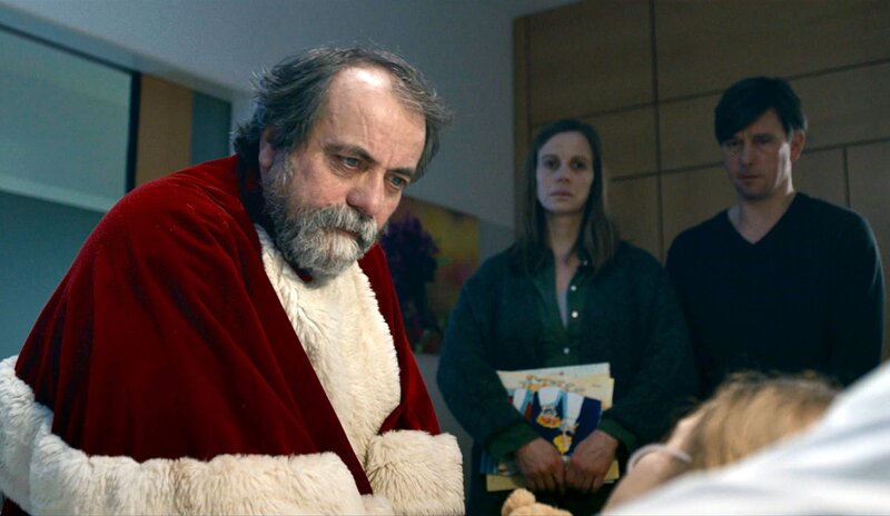 Als Weihnachtsmann spendet Klaus (Matthias Brenner, links) der kleinen Clara (Helene Pieske, liegend) Trost, während sie mit ihren Eltern (Julia Jäger, Peter Schneider) die letzten Stunden im Krankenhaus verbringt.Bild: © MDR/Christian Trieloff
