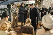 Der Boandlkramer (Michael Bully Herbig, 2. v. links oben) wartet neben Bürgermeister Brehm (Sigi Zimmerschied, rechts daneben) auf den Zug mit Kriegsheimkehrern.Bild: © Hendrik Heiden / LEONINE, herbX film, Perathon Medien GmbH
