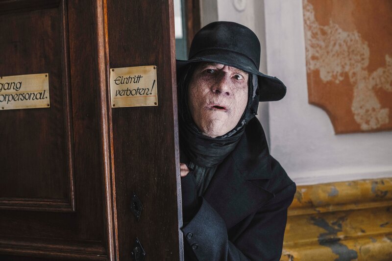 Der Boandlkramer (Michael Bully Herbig) fürchtet, dass der Zug mit Kriegsheimkehrern Gefis im Krieg verschollenen Liebsten nachhause bringt.Bild: © Hendrik Heiden / LEONINE, herbX film, Perathon Medien GmbH