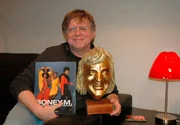 Autor Roland Helm mit aktuell erschienenem Boney M.-Buch und goldener Farian-Maske. Die Maske wurde Frank Farian von der Bühnenbildnerin des Musicals "Daddy Cool" überreicht.Bild: © SR