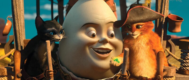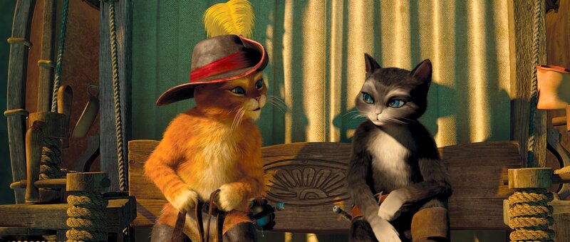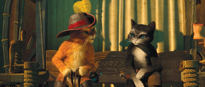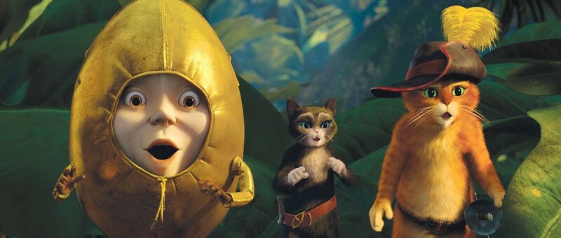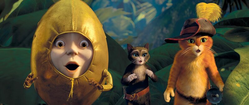 Der gestiefelte Kater (deutsche Stimme: Benno Fürmann) ist stolz auf seine unzähligen Übernamen wie "flauschiger Don Juan" oder "der rote Rabauke". Im ganzen Land ist er als gesetzloser Tunichtgut gefürchtet. Als junger Kater wurde er von seinem besten Freund, dem Ei Humpty Dumpty (Elton), zu viel Unfug verleitet und schliesslich zu einem Bankraub angestiftet. Seitdem ist der Kater auf der Flucht und will nichts mehr mit Humpty zu tun haben. Denn er sieht sich als Ehrenmann und kann dem Freund nicht verzeihen, dass dieser seinen Namen beschmutzt hat. So zieht er mit Schlapphut und Stiefeln allein als Outlaw durch die Lande, stets auf der Suche nach Abenteuern - und nach den mysteriösen Zauberbohnen, die eine Ranke in den Himmel zu einem legendären Schatz wachsen lassen. In einem Lokal erfährt der Kater, dass das Gaunerpärchen Jack (Christian Berkel) und Jill (Andrea Sawatzki) im Besitz der Bohnen ist, diese jedoch strengstens bewacht. Er beschliesst die beiden zu überlisten. Dabei kommt ihm jedoch ein anderer Kater in die Quere. Es beginnt eine wilde Verfolgungsjagd quer durch das Städtchen San Ricardo. Sie endet in einem wilden Tanz - und der andere entpuppt sich als attraktive Katzendame Kitty Samtpfote (Carolina Vera Squella). Wie sich herausstellt, macht Kitty gemeinsame Sache mit seinem altem Erzfeind: Humpty Dumpty. Dieser will ihn, mithilfe von Kittys Charme, dazu überreden, ihnen zu helfen, die Zauberbohnen zu stehlen. Der Kater will zunächst nichts davon wissen. Erst nachdem er Kitty seine ganze Leidensgeschichte erzählt und ihr klargemacht hat, dass er nur mitmacht, wenn er damit die Schulden begleichen bei der von ihm ausgeraubten Bank begleichen kann, lässt er sich dazu überreden. Tatsächlich gelingt es den beiden Katzen und dem Ei die Zauberbohnen in Teamarbeit zu entwenden. Doch kaum ist der Schatz zum Greifen nahe, wird klar, dass der gestiefelte Kater sich leichtgläubig auf einen schlechten Deal eingelassen hat. Der deutsche "Film-Dienst" lobt, "mit welchem Einfallsreichtum und welch grossartigen Kamerafahrten über die Totalen von Wüste und Weltraum diese unterhaltsame Jagd nach Zauberbohnen und Goldeiern befeuert wird." Und er verweist auf die unglaubliche Fülle an Ideen und popkulturellen Zusammenhängen, die der Film bietet: "Ähnlich wie bei "Shrek" öffnet DreamWorks also auch hier wieder ein grosses Bilderbuch westlicher Sagen- und Märchenstoffe und Referenzen, die bis in die Moderne reichen. Kreativ und clever taucht ein recht buntes Bouquet detailliert animierter und durchdachter Figuren auf.".