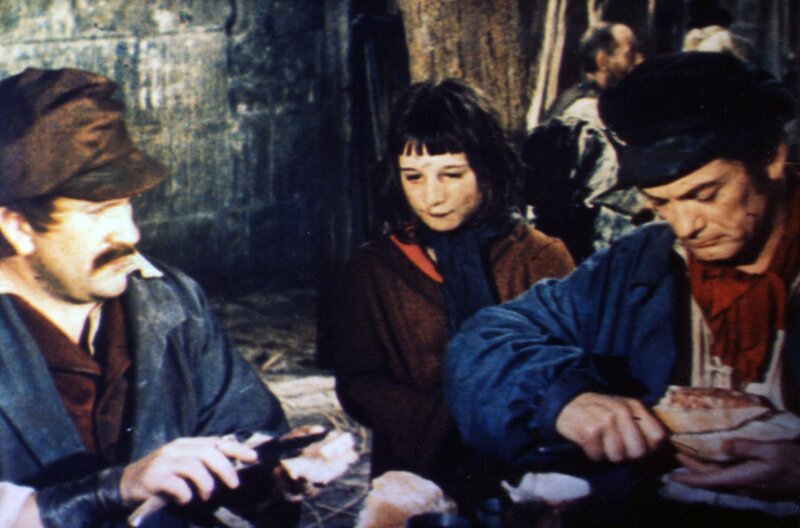 Ein kleines Mädchen erbettelt bei einem Arbeiter namens Messerstecher (Pierre Mondy, li.) und Graf Rodolphe de Sambreuil (Jean Marais, re.), der sich verkleidet als Türsteher ausgibt, etwas Brot.