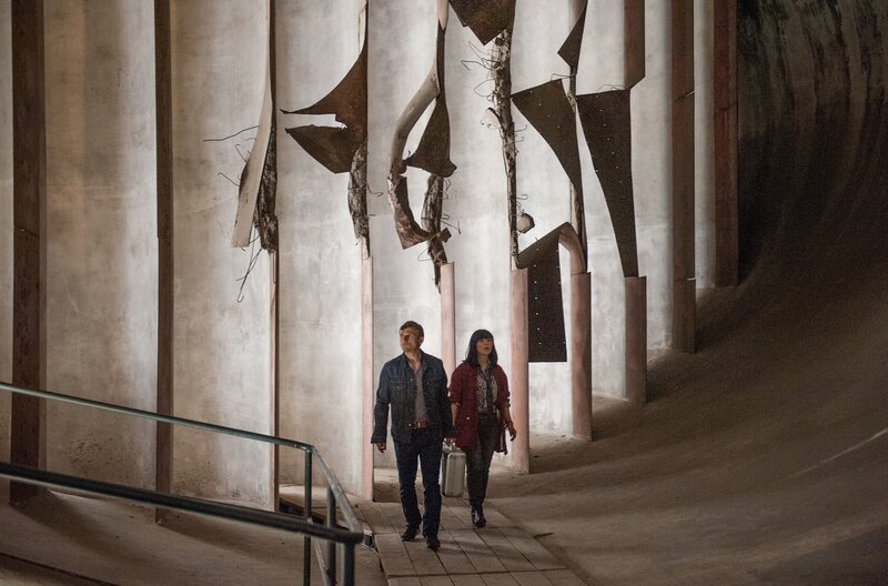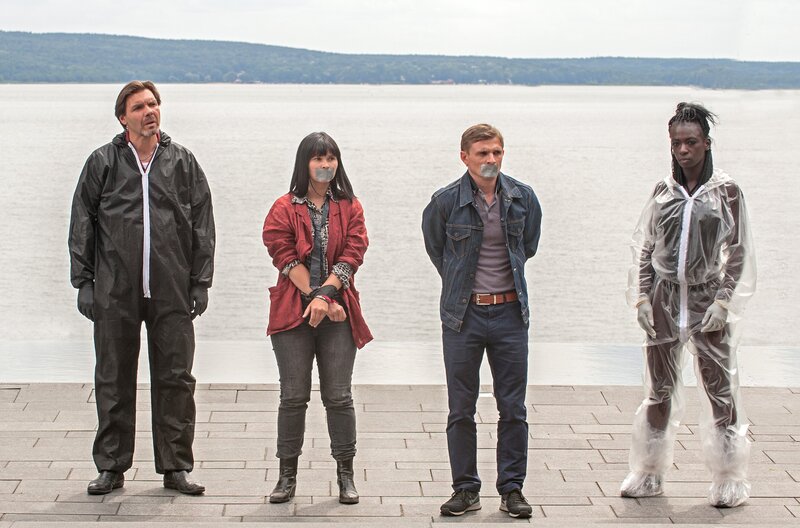 Hauptkommissar Kolbe (Max Hopp) kommt hinzu, als Carola Rimschow (Anna Fischer) und Carsten Lanner (Florian Lukas) in der Villa des Bauunternehmers Maschmann gefangen genommen werden. Szene mit der Bodybilderin (Rosaline Koroma, re.).