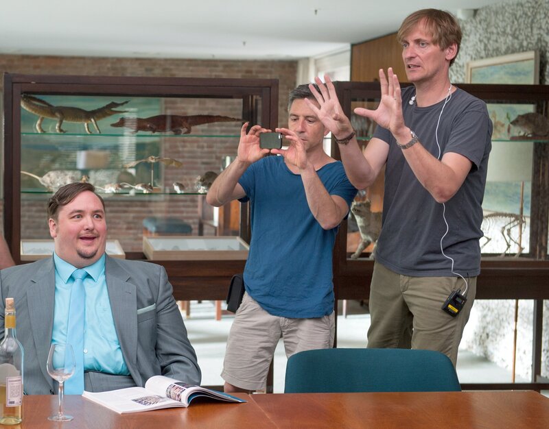 Bürgermeister Koppelberg (Uwe Preuss) gibt vor dem Roten Rathaus mit dem Kammerjäger Toni Matthes (Marc Hosemann) Interviews zum Stand der Rattenplage in Berlin.