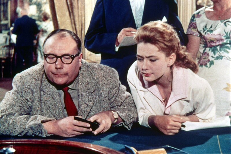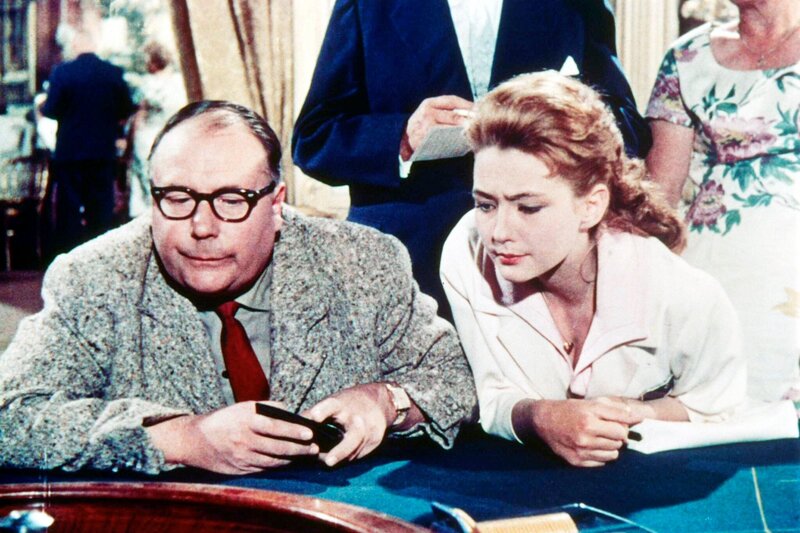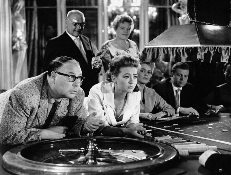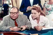Kiki (Christine Kaufmann, Mi.) hat es durchgesetzt, dass der biedere Gottfried Sänger (Heinz Erhardt, li.) sie ins Spielkasino von Baden-Baden führt. Viel Glück scheinen sie hier allerdings nicht zu haben.Bild: © ZDF, Deutsche Film Hansa