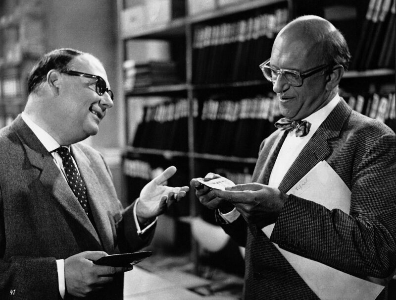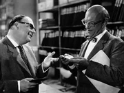 Seinem Kollegen und Freund Robert Hiss (Werner Finck, re.), seines Zeichens Bildredakteur, zeigt Gottlieb Sänger (Heinz Erhardt) seine Fahrkarte nach Baden-Baden. Von dort aus wird er eine Fußwanderung durch den Schwarzwald unternehmen.Bild: © ZDF und Deutsche Film Hansa